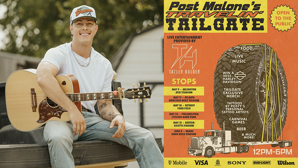 Country artist and TikTok sensation Tayler Holder is hitting the road with Post Malone’s Travelin’ Tailgate, a free parking lot party series ahead of select stadium shows on Post’s North American tour. The game-day-style events feature live music, exclusive merch, photo ops, carnival games, and tattoos from Post’s personal artists. Holder will perform at six of the ten scheduled stops, beginning May 9 at AT&T Stadium in Arlington, Texas, with additional appearances in Atlanta, Detroit, Philadelphia, Boston, and Miami.