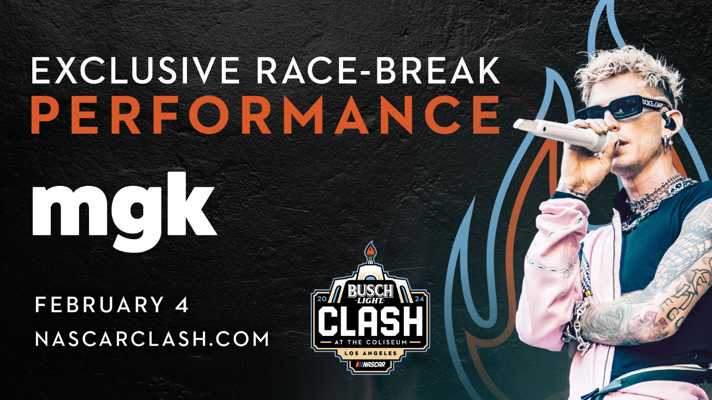 NASCAR revealed plans for MGK to give “a show-stopping race break performance” during the 2024 Busch Light Clash at the Coliseum on Sunday, Feb. 4.